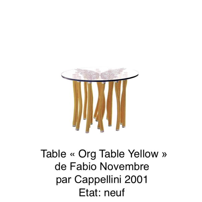 Table « Org Table Yellow » Tom Novembre Année 2001 Cappellini Etat: Neuf Prix sur demande Description: At first glance, the Org table by Fabio Novembre seems an unlikely paradox: the top appears to rest atop elements that hang from above, like tendrils. The internal solidity is hidden from view, thanks to the careful placement of…