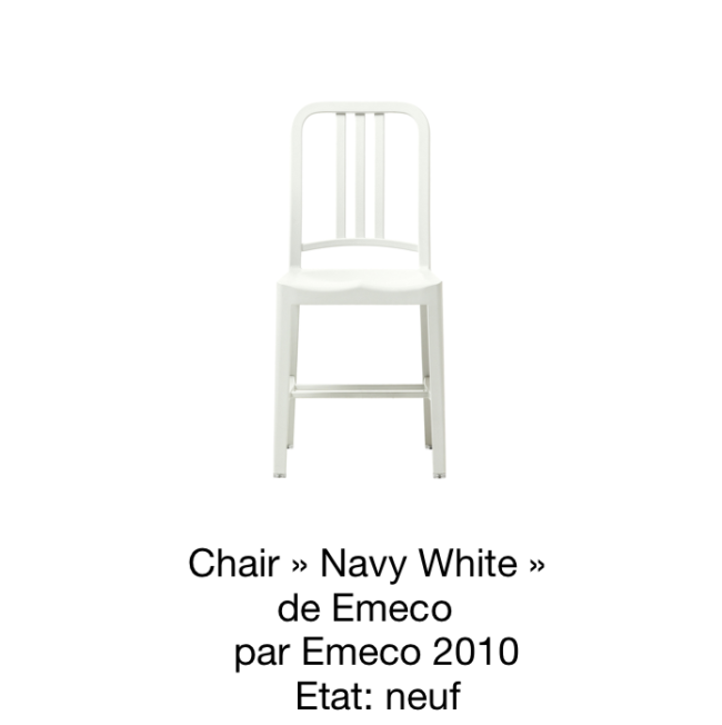 Chaise « Navy White » Emeco Année 2010 Emeco Etat: Neuf Prix sur demande Description: 111 Navy® Chair is the first ever chair made from recycled bottles. Each chair is made from at least 111 plastic bottles. La 111 Navy® Chair est la toute première chaise fabriquée à partir de bouteilles recyclées. Chaque chaise est fabriquée…