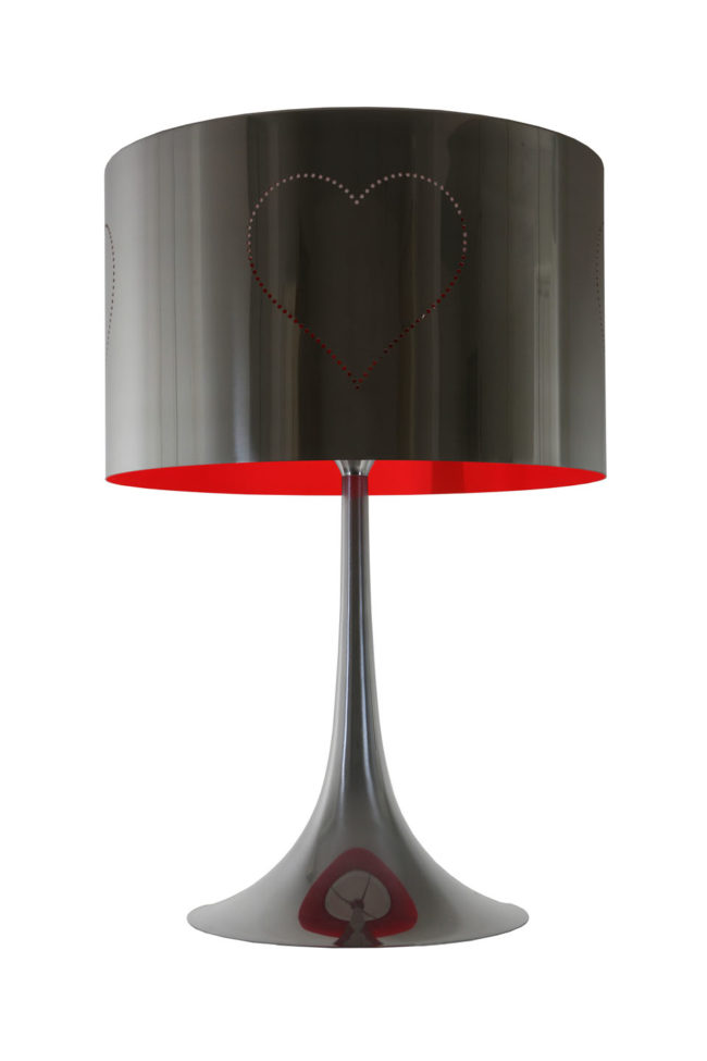G&G Edition 2016 Edition of 9 + AP Base: – Polished Aluminium Diffuseur Inside: – Matt Red Fluo Paint Diffuseur Outside: – Polished Aluminium – Heart Holes Decor Glass: – Frosted Glass Height: 680mm Cutout Width: 450mm Base Width: 308mm Lamp included: Halo E27 205w 220v-240v With Dimmer Price : 2290€